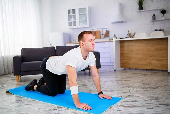 • کاری که باید انجام دهید، این است که چهار دست و پا روی زمین قرار بگیرید. دست های شما باید موازی با شانه و پاهایتان موازی با لگن قرار بگیرد.